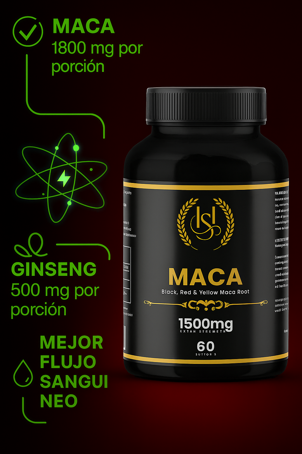 Está formulado para aumentar la energía, vitalidad y rendimiento físico gracias a la combinación de maca negra, ginseng y L-arginina.